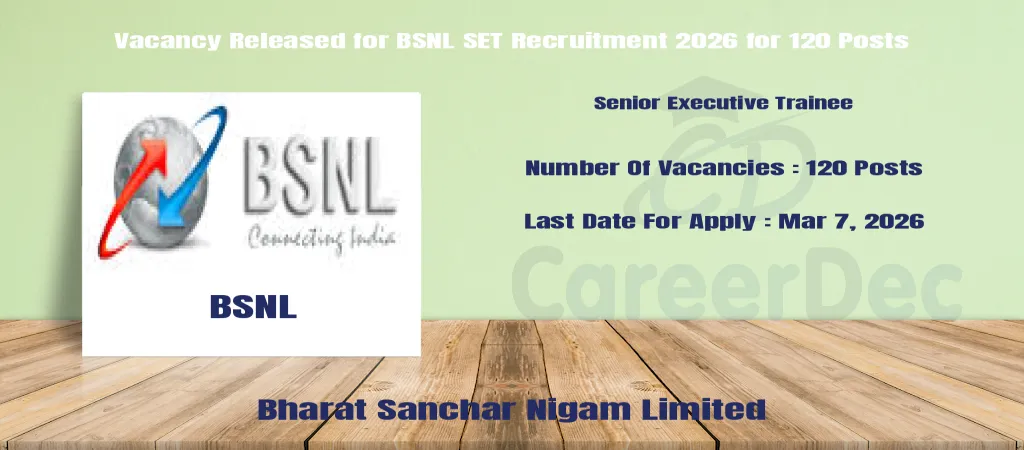 The online registration has been released along with Bharat Sanchar Nigam Limited ( BSNL ) Senior Executive Trainee Notification 2026. Aspiring candidates of Bharat Sanchar Nigam Limited ( BSNL ) Senior Executive Trainee apply online from Feb 5, 2026 to Mar 7, 2026. As per the new vacancy 2026, the Bharat Sanchar Nigam Limited ( BSNL ) Senior Executive Trainee Exam Dates have been updated below.