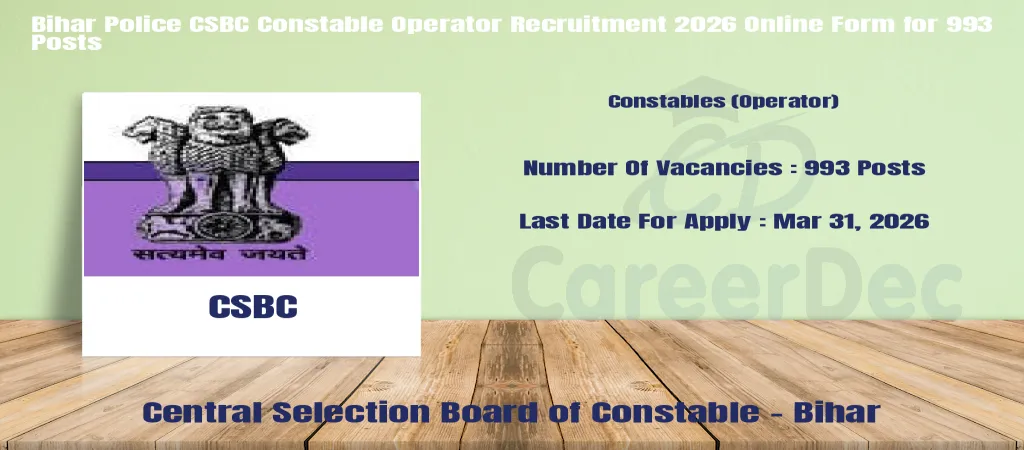 The online registration has been released along with Central Selection Board of Constable - Bihar ( CSBC ) Constables (Operator) Notification 2026. Aspiring candidates of Central Selection Board of Constable - Bihar ( CSBC ) Constables (Operator) apply online from Mar 1, 2026 to Mar 31, 2026. As per the new vacancy 2026, the Central Selection Board of Constable - Bihar ( CSBC ) Constables (Operator) Exam Dates have been updated below.