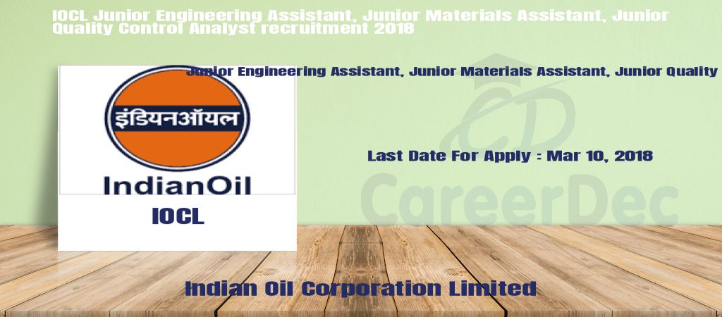 The Indian Oil Corporation Limited IOCL releases a detailed Junior Engineering Assistant, Junior Materials Assistant, Junior Quality Control Analyst job notification 2018 on its official website , You can get the latest govt jobs notifications about the Indian Oil Corporation LimitedIOCL Junior Engineering Assistant, Junior Materials Assistant, Junior Quality Control Analyst exam 2018 through the below summary.